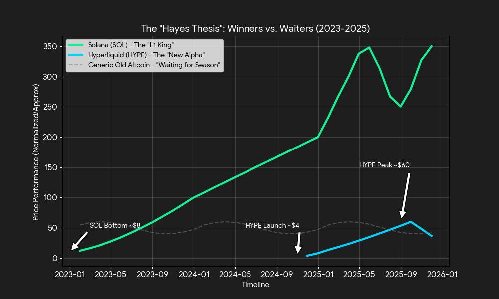 • Hyperliquid (HYPE): Hayes pointed to this decentralized exchange token as the “most exciting story” of the current cycle. He noted its meteoric rise from an initial valuation of a few dollars to trading near $60, a massive multiple that effectively is an entire bull market in a single asset.